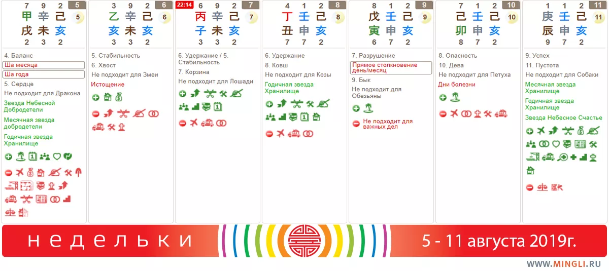 Вторник, 6 августа. Отличный день, прекрасно подходит для занятий литературой и путешествий, переезда в новый дом, ремонта, земляных работ, встреч на официальном уровне и с благородными людьми. А вот начинать новое пока не стоит: завтра - начало нового китайского месяца, ци сезона истощена и энергии будет маловато для яркого начала.