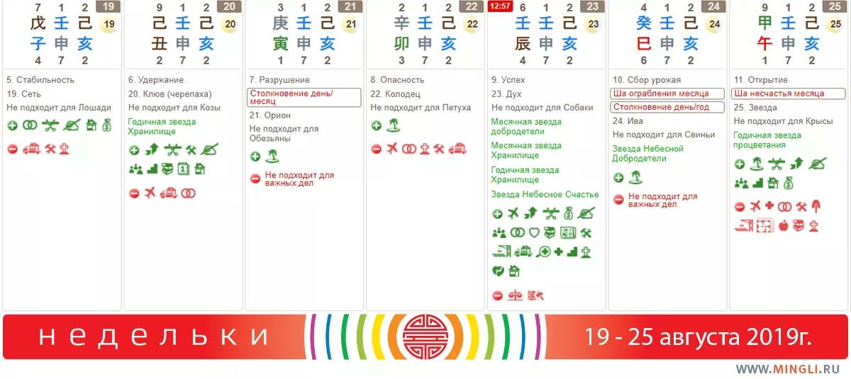 В понедельник, 19 августа, можно использовать по полной, начинать проекты, от которых вы хотите длительного и стабильного результата. Особенно это рекомендовано сильным Землям, особенно янским. (Не подойдет тем, кто родился в день Лошади). В принципе, день подходит для большинства позитивных дел. Важно, чтобы часть процесса (наименее важную) сделал за вас кто-то другой.