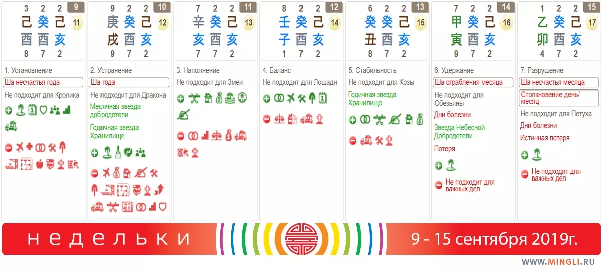 11 сентября, среда. Три дня подряд можно не отказывать себе ни в чем, смело планируя и действуя. Среда прекрасна не только для запуска нового проекта и любых позитивных дел, но также и для активизаций, перестановки мебели (для всех, кроме Змеи). Например, час Свиньи - очень скоростной и прибыльный. Вы можете переставить кровать или же прогуляться в этот час на восток: время обещает продвижение по службе, финансовое процветание и успехи в учебе.