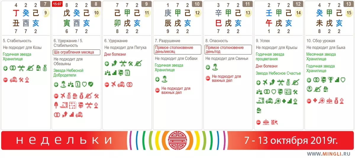 10 и 11 октября проводим спокойно, занимаясь обыденными делами. Чрезмерная активность 10 октября приводит к потере денег и сплетням, а 11е не стоит использовать для свадьбы, начала бизнес проектов и путешествий. В целом, дни-столкновения, если такие же взаимодействия не отражены в вашей карте бацзы, не так и опасны. Но важные дела на этот период лучше не планировать, так как люди, вовлеченные в ваш проект, могут быть чувствительны к конфликтной энергии дня.