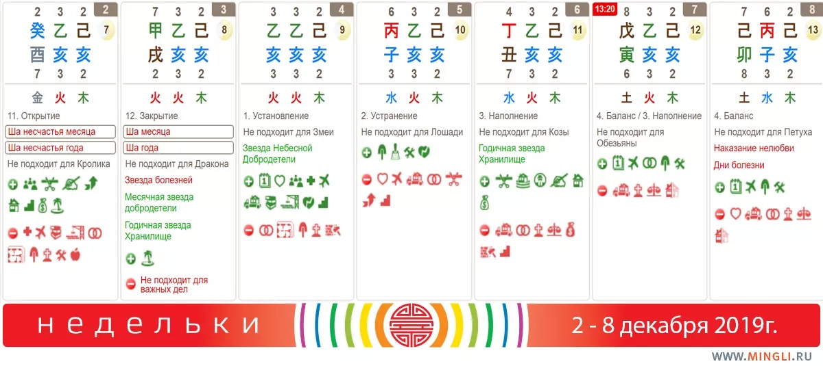 7 декабря, суббота. Начало нового месяца (проверьте, когда он начинается в вашем городе, зайдя в календарь на сайте mingli.ru). Обычно на первый день сезона важных дел не назначают, так как энергии не очень стабильны. Зато хорошо делать разные активизации, в том числе, согревание денежной звезды (мы публикуем несколько дат в прогнозе на месяц). В час Змеи вы можете прогуляться на юго-восток или же поставить на пару часов вентилятор в юго-восточном секторе дома. Убедитесь только, что тут нет неблагоприятных звезд. Если вы не знаете, какие у вас в доме летящие звезды, лучше не делать активизации, а просто прогуляться в указанном направлении. Вы можете увидеть радостную женщину в зеленом или черном, ведущую за руку ребенка. Прогулка обещает медленное, но верное развитие и процветание.