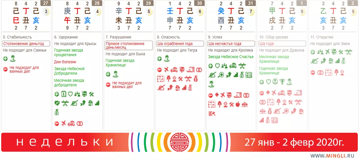 28 января, вторник. Хороший день, его поддерживают много благородных звезд. Приносит процветание семье, рост богатства и собственности. Поэтому можно заниматься большинством позитивных дел. Час Дракона можно использовать для решения сложных проблем и финансовых вопросов: прогуляйтесь на запад, размышляя о своих задачах. Отлично, если вы встретите человека, играющего в мяч, или женщину, которая тянет или несет ребенка.