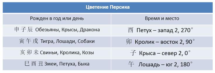 Найдите животное своего дня рождения в таблице в левой колонке, а в правой написано то животное, которое является для вас Цветением Персика и направление, которое ему соответствует. Ваша задача – найти в своей квартире или дома место, которое нужно активизировать. Самый простой способ – определить направление из центра квартиры или своей комнаты с помощью компаса.
