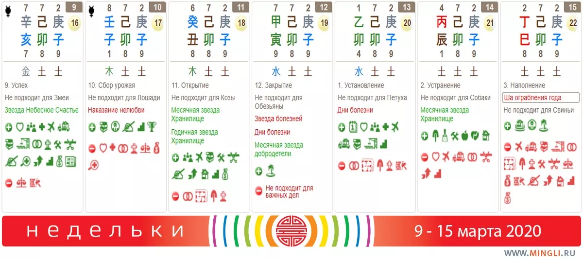 9 марта, понедельник. Очень благоприятный день, содержащий большое количество разных благородных звезд. Хороший день для свадьбы, начала бизнес-проектов, переезда в новый дом, путешествий, строительства. В течение 60-120 дней принесет неожиданное богатство, помощь и поддержку полезных людей. Очень благоприятен для исполнения любых планов. Сильным Металлам рекомендуем час Козы для начала дел, связанных с деньгами (заработать, а не потратить, конечно).