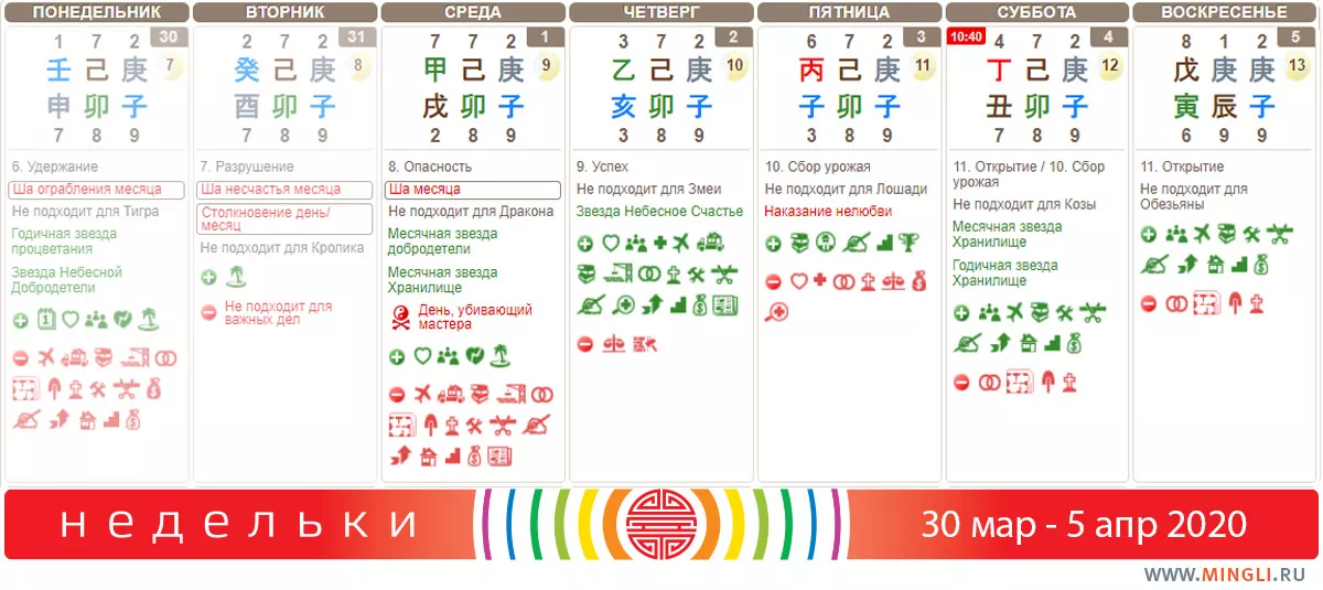 Что ж, даже не знаешь, писать недельки для тех, кто пока свободен или тех, кто сидит на карантине? Главное, что хочется сказать - не забывайте про фэн шуй! Март, месяц Кролика, заканчивается, наступает апрель, месяц Дракона. (У меня тут стоит время начала  месяца для Питера, для своего города - посмотрите сами.) Так вот, обязательно проверьте фэн шуй своей квартиры или дома, куда прилетела месячная 5 (юго-восток). Поставьте коррекцию в комнатах с 5, отодвиньте кровати, стоящие на юго-востоке, скорректируйте двери, если они на ЮВ относительно вашего спального места. В этом месяце повышенное внимание уделяйте тем, у кого есть в картах бацзы столкновение Дракон-Собака или вреден Дракон. Берегите себя, повышайте иммунитет, не нервничайте, высыпайтесь и мойте руки, конечно).