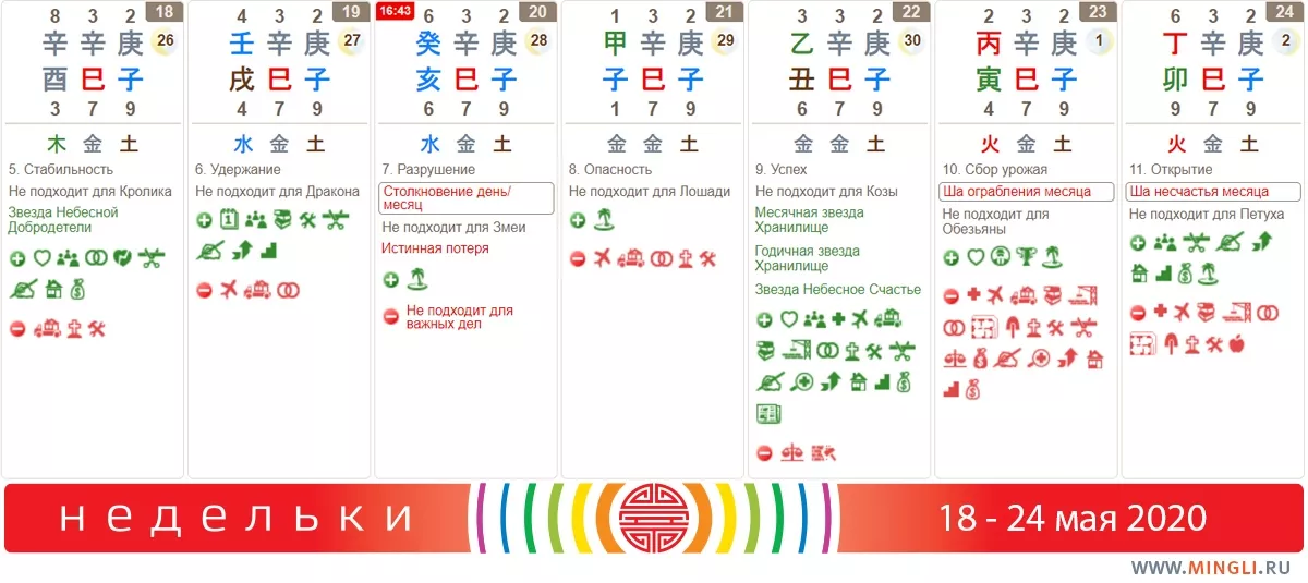 18 мая, понедельник. Хороший день, однако те, кому неблагоприятен Металл, могут чувствовать себя не комфортно. Подходит для большинства позитивных дел, рассчитанных на долгосрочный эффект и стабильность. Хорошо делать что-то коллективно, например, проводить виртуальные собрания.
