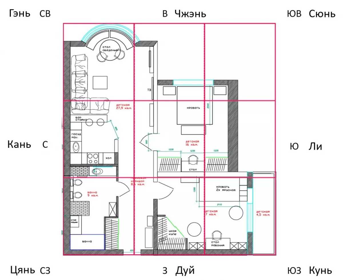 Затем мы изучим то, что получилось и сравним направления сторон света с органами человеческого тела, статусами в семье и гуа, учитывая негативные влияния. Итак, поехали.