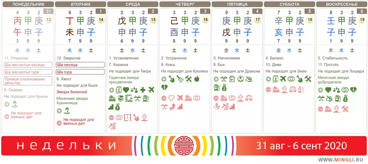 1 сентября, вторник. Ци слегка заторможенная, хороша только для завершения каких-то дел или повседневки. День также не подходит для начала лечения. Зато можно планировать бюджет. Со школьниками можно собраться в час Лошади на западе дома и пофантазировать, как прекрасно они будут учиться. Возьмите мяч (это часть активизации) и, перекидывая друг другу, называйте различные критерии успеха, например: “пятерки”, “лучший ученик” и так далее. на стол посередине поставьте синюю вазу или блюдо. Бычкам 2009 года не очень подойдет эта активизация.