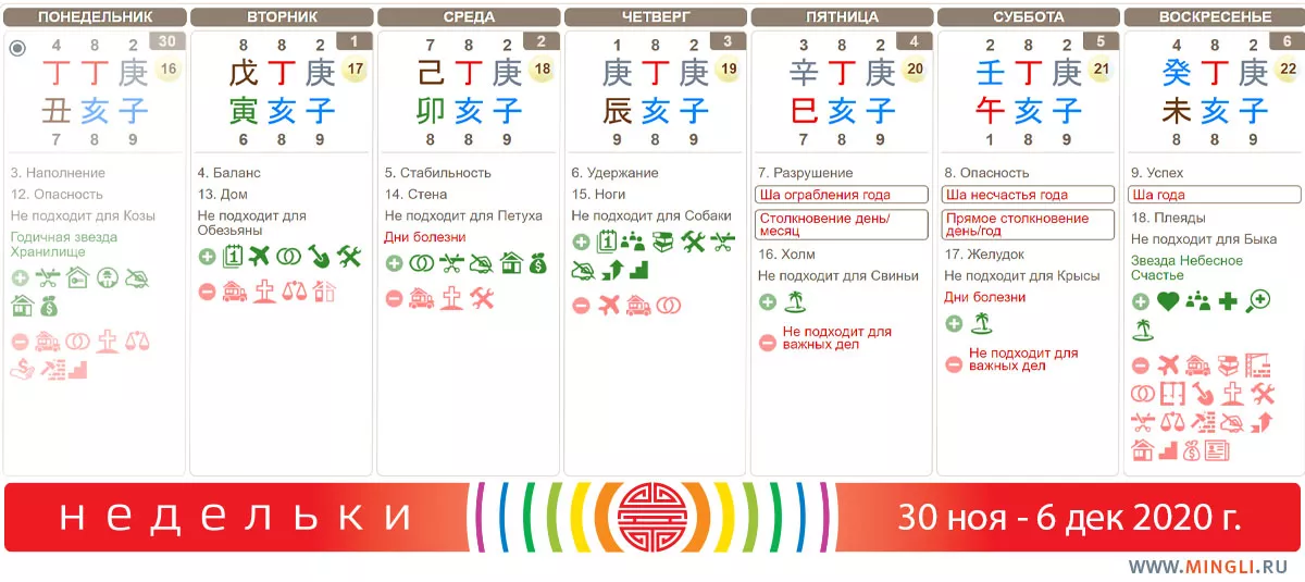 1 декабря, вторник. Подойдет для повседневных, как говорят китайцы “незначительных” дел. Подумайте о балансе: работы и семьи, души и тела, спланируйте, что и как будете менять. Сегодня самое время для таких размышлений (делать это можно, например, в час Змеи, устроившись на юго-востоке дома или офиса). Если планируете ремонт или земляные работы, начинать их лучше со вторника по четверг.