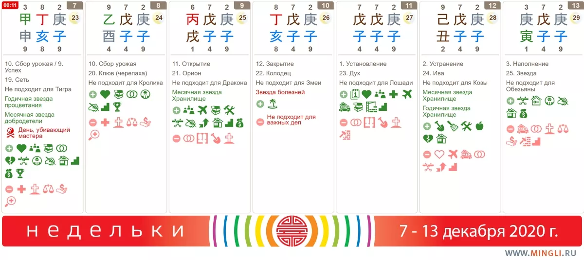 7 декабря, понедельник. Хороший день, несмотря на начало месяца, в нем много благородных звезд, поэтому он благоприятен для большинства важных дел, и приносит богатство, рождение прекрасного сына, удаление препятствий в делах. Можно договариваться, обсуждать, начинать новые проекты. Чего не стоит делать - делать измерения и затевать перестановки. Фэншуисты сегодня отдыхают.