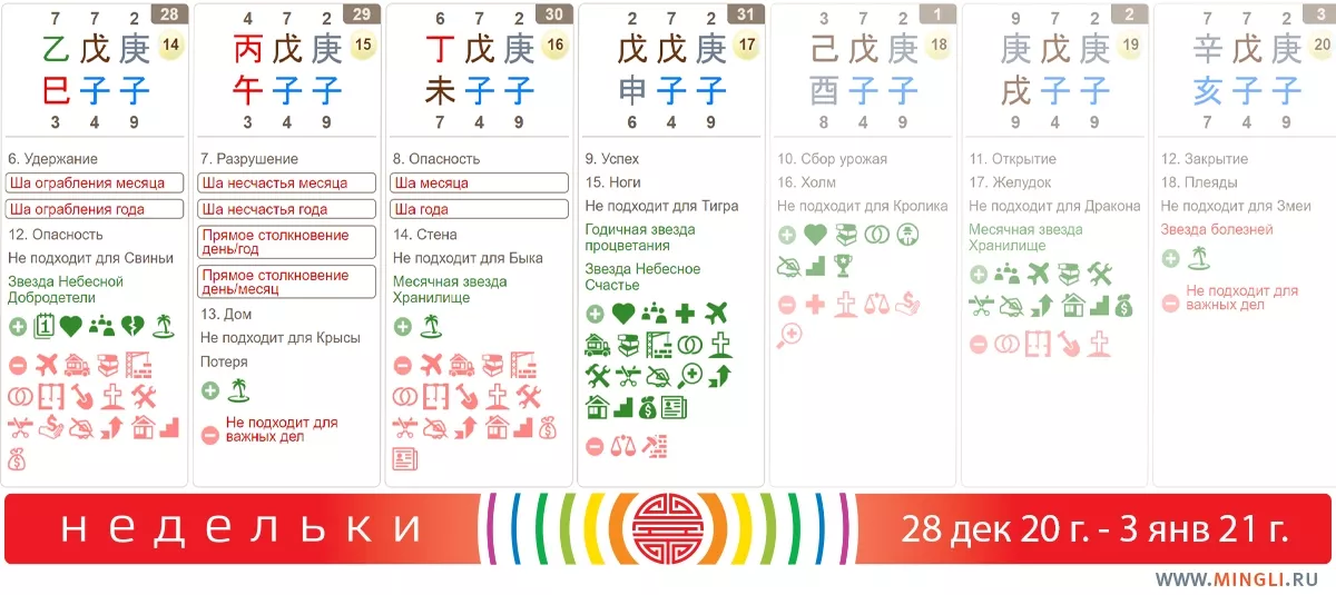 29 декабря, вторник. Лучше поставить дела на паузу - убраться дома или на рабочем столе, не принимать важных решений, не пытаться успеть все и сразу, особенно на машине. День не подходит для экстремальных видов спорта (если вы уже в отпуске). Будьте осторожны на спуске, особенно если вы родились в годы Крысы или Лошади, или столкновение Крыса-лошадь есть у вас в карте бацзы.