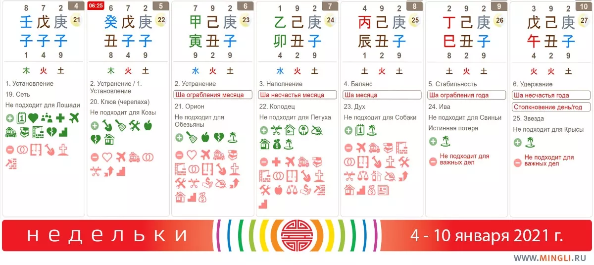 5 января, вторник. Часто спрашивают, как понять энергии дня смены сезона. Посмотрим на примере. Сегодня до смены месяца (для разных городов смена месяца происходит в разное время) идет день Устранения в месяц Крысы. После смены (время написано на красной бирочке) начинается месяц Быка и день Установления. Почему так? Потому, что 12 управителей дня определяются в зависимости от земной ветви (животного месяца). Вот и получается, что первую половину дня можно планировать одно, а во вторую - другое.