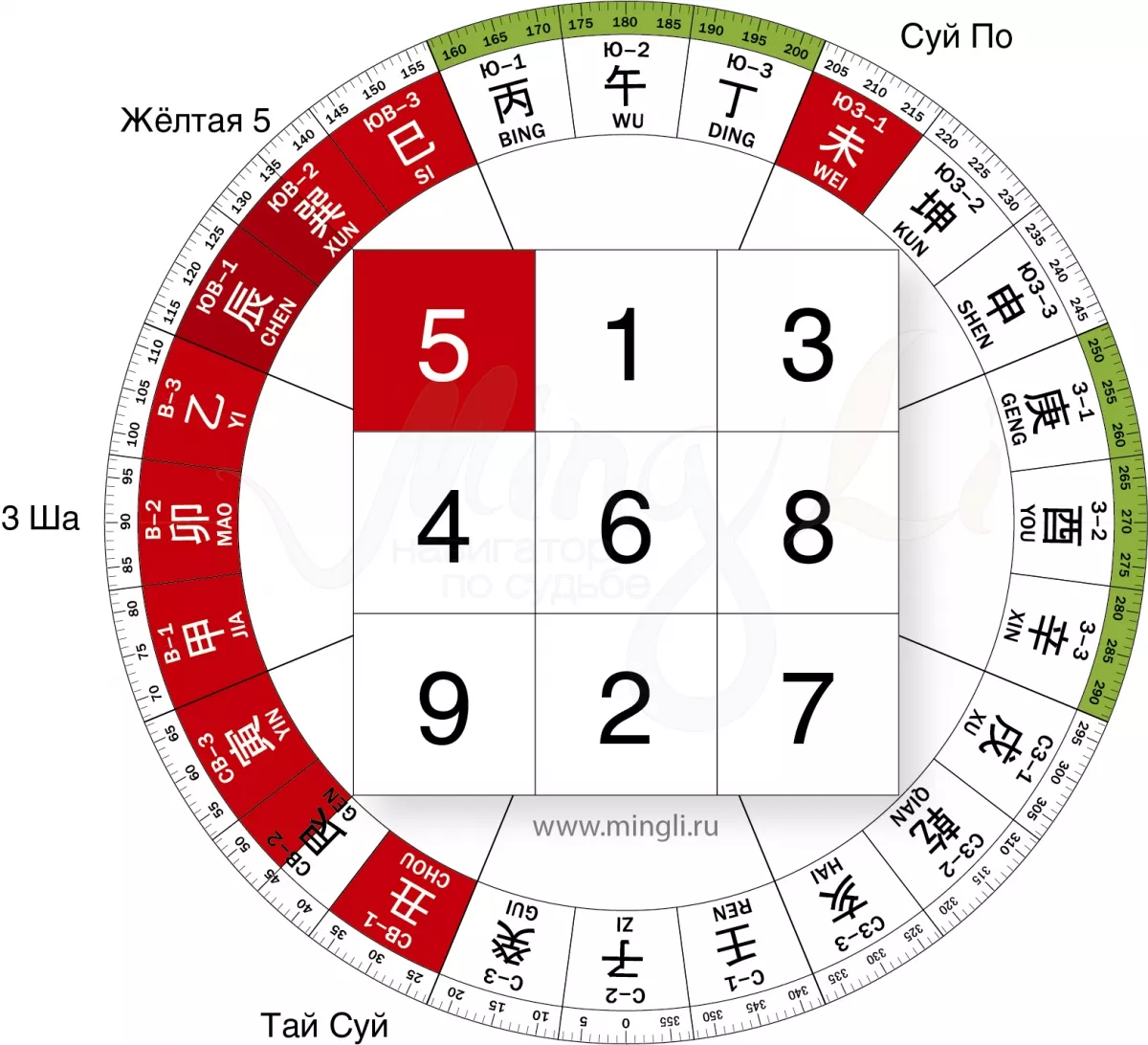 Главная энергия года, Князь Года или Тай Суй, располагается на северо-востоке 1 (первые 15 градусов северо-восточного сектора).