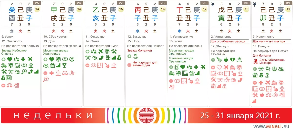 25 января, понедельник. Могут активничать все, кроме Кроликов по году рождения, а особенно тем, кому полезны вода и металл. День прекрасен для начала новых проектов, свадьбы, строительства, начинания бизнеса, переезда в новый дом. Дела, начатые в этот день, приносят процветание потомкам и много счастья. Всем, кому для баланса карты очень нужен огонь, рекомендуется беречь здоровье, не переохлаждаться.