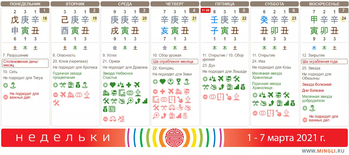 2 марта, вторник. Неплохой день (Кроликам только не повезло), можно заняться решением финансовых вопросов, запланировать начало проекта средней важности. Сильные Огни могут сегодня блистать, поражая окружающих своей активностью. Традиционно, в день Опасности не рекомендуются травматичные виды спорта