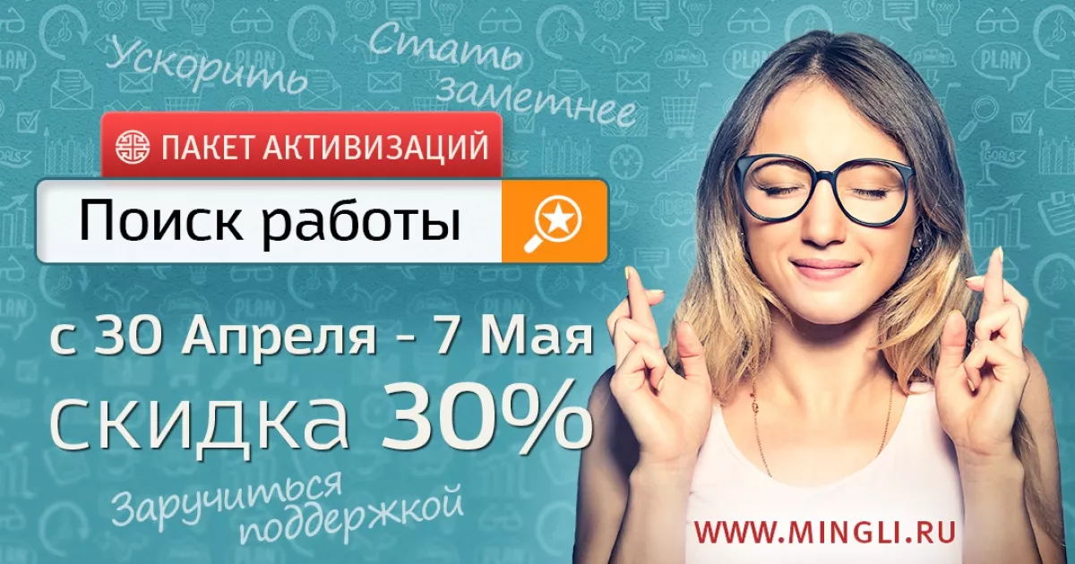 С 30 АПРЕЛЯ И ДО 7 МАЯ действует скидка 30 % на пакет активизаций ПОИСК РАБОТЫ.