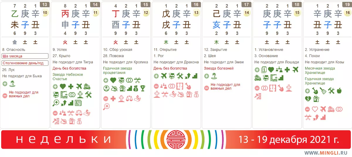 13 декабря, понедельник. Начинаем с отдыха)  Конечно, работу и повседневные дела отменять не стоит. Но помните, что день конфликтный, мысли и чувства могут быть запутанными, поэтому особенно лезть на рожон не стоит: обходите спорщиков стороной. Особенно если вы иньское Дерево на Козе или Быке. На дороге и за рулем стоит быть осторожнее, в час Козы – тем более. Только сегодня на этой неделе не стоит начинать ремонт, все остальные дни годятся для старта.