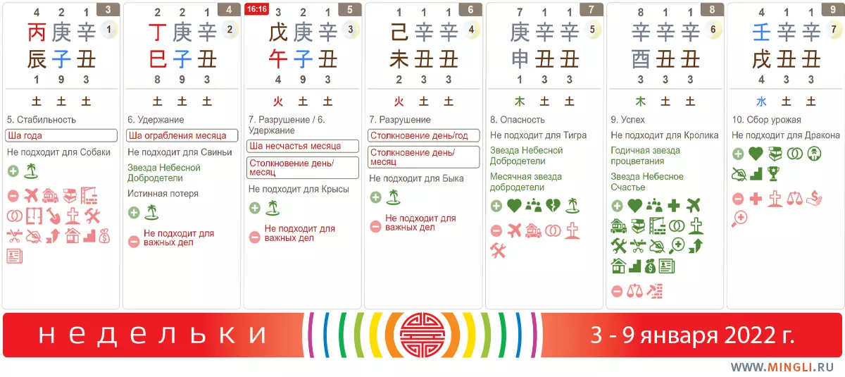 Первые 4 дня недели как будто специально созданы для того, чтобы продолжить отдых). Ремонт также начинать не следует. Кстати, 5 января начнется последний месяц года Быка и его особенность заключается в том, что столп месяца повторяет столп года – это тоже металлический Бык. А это означает, что в январе тенденции года будут усилены. Если Металл и Земля вам не полезны, лучше провести месяц максимально спокойно, не принимая важных решений. Быкам, Козочкам (особенно с иньским Металлом сверху) также стоит прислушаться к этому совету. Кстати, 14 января начинается период ретроградного Меркурия, так что планируйте запуск новых проектов и покупку техники до этого времени.