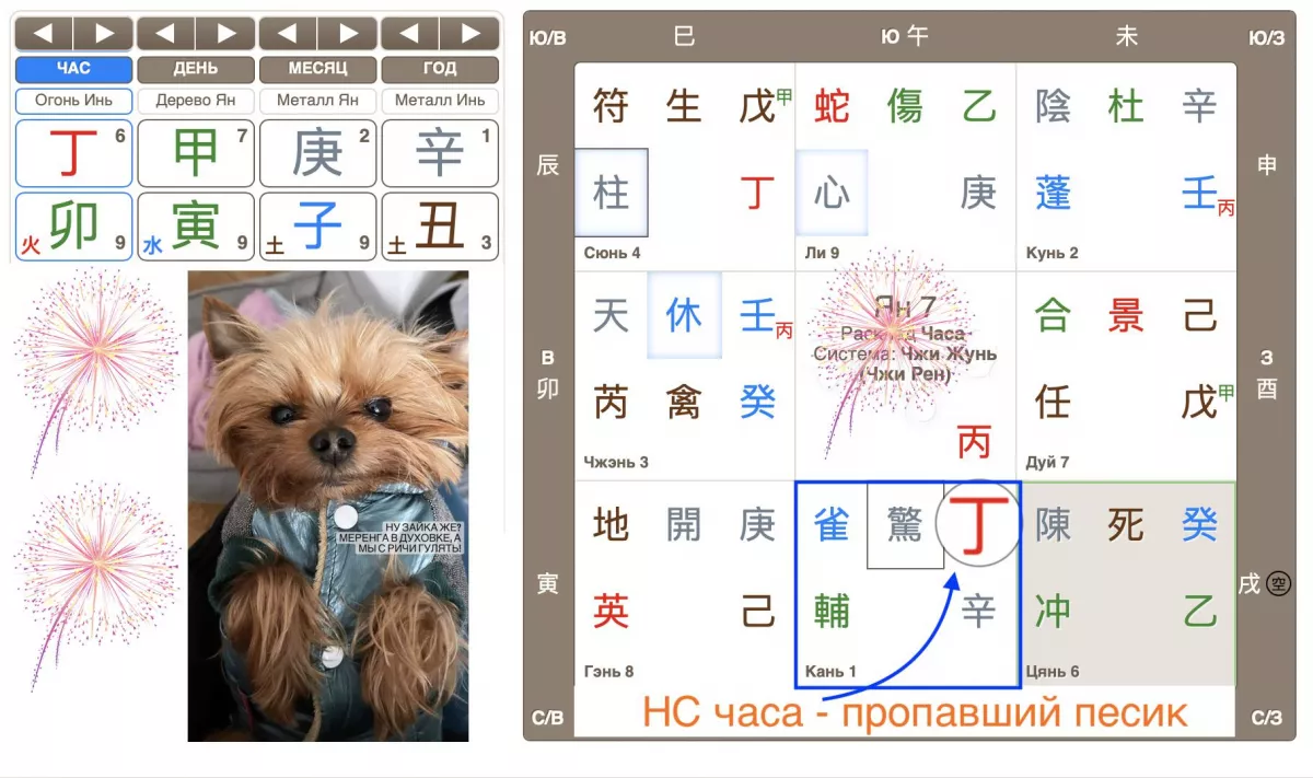Предположила, что, вероятнее всего, собака будет найдена за вознаграждение, час порождает символы денег 戌 и 生. И, с помощью множества объявлений 景 丁, которые разместила подруга. Девушка к тому времени, прямо ночью, оперативно разместила объявления в самых разных каналах. В раскладе символы информации 景 丁 порождают пропавшего песика НС часа 丁. Два важных момента: обязательно разместить как можно больше объявлений с фото собачки и указать в них информацию о вознаграждении.