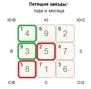 Северо-запад с точки зрения летящих звезд не очень гармоничная комбинация, могут быть травмы ног, проблемы с суставами, печенью, головные боли. Аккуратно обращайтесь с режущими, металлическими предметами, особенно это актуально для мужчин пожилого возраста. Комбинация звезд может принести продвижение по службе, новые проекты, а также сильную загруженность, которая может привести к срывам. Могут быть конфликт с начальством, если у вас, например кабинет на северо-западе, или с вашим столом в кабинете формируется такая комбинация.