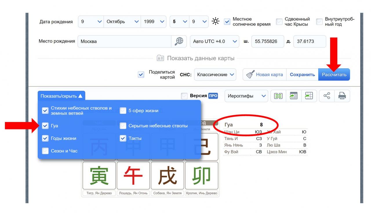Также число гуа можно рассчитать у нас на сайте, в калькуляторе Бацзы: