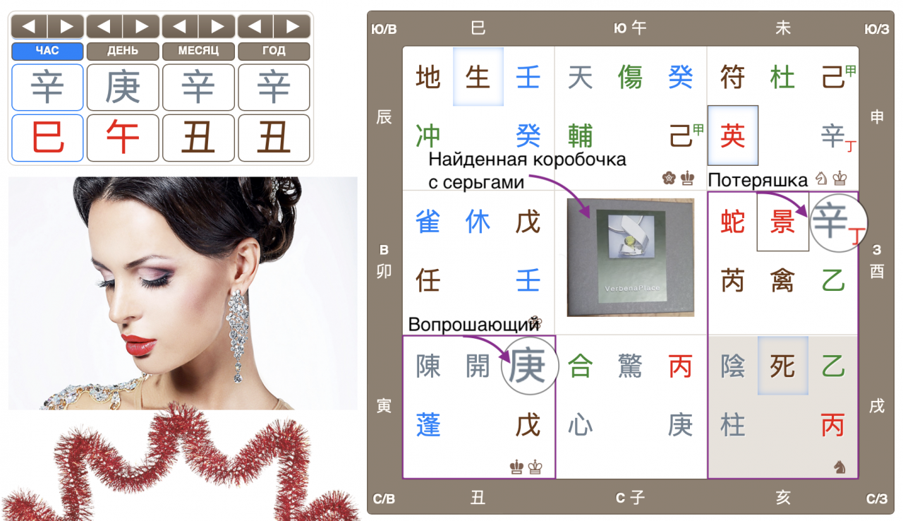 Как точен Ци Мэнь! Даже Небесный ствол часа Дело выпал на ствол Синь – ювелирное украшение. Украшение очень дорогое и по стоимости (ствол Тай Суй тоже Синь) и эмоционально (подарок мужа). Серьги Синь в Пустоте (серый квадрат) – значит найти не просто.