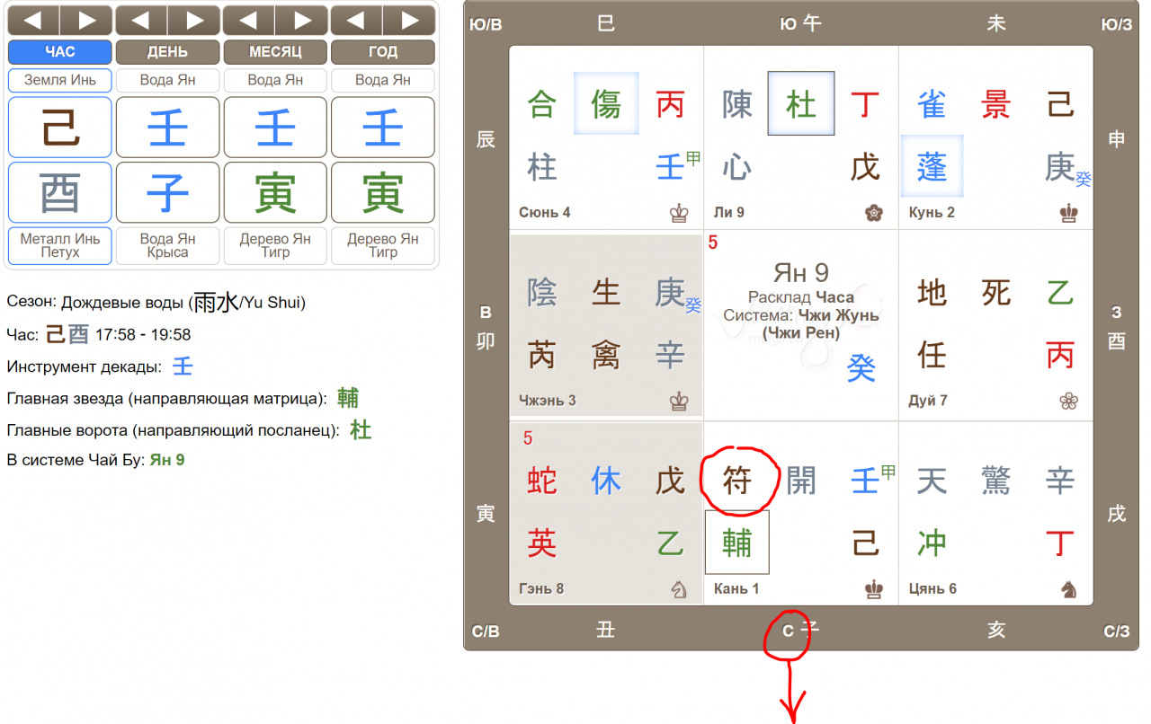 1. Если вы ничего не понимаете в Ци Мэнь, нужно уметь находить и опознавать всего один иероглиф: Главный Дух, Джи Фу и именно в его направлении двигаться. Если вы уже знаете направление, то полистайте часы и выберите тот час, когда в направлении, нужном вам есть Джи Фу. Направление написано на серой рамочке.