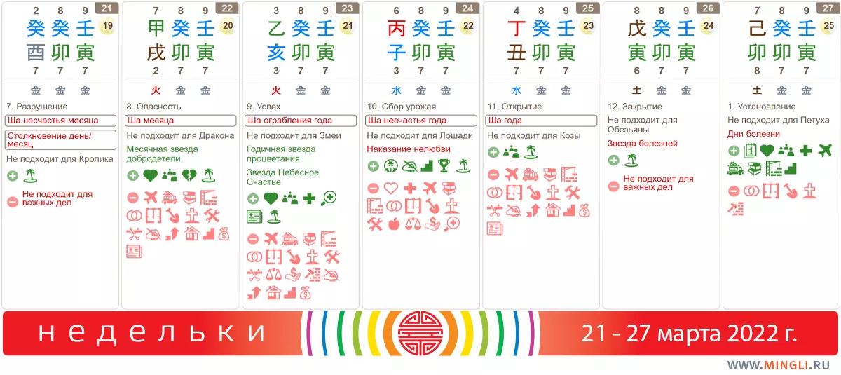 21 марта, понедельник. Столкновение, поэтому ставим важные дела, насколько это возможно, на паузу. Петухи, Кролики, люди с парой Петух-Кролик в карте – вам рекомендуется снизить риски: осторожнее за рулем, отложите занятия экстремальными видами спорта на лучшие времена и т.п.