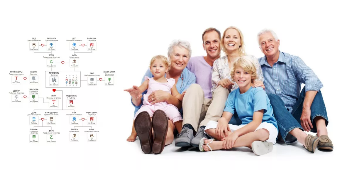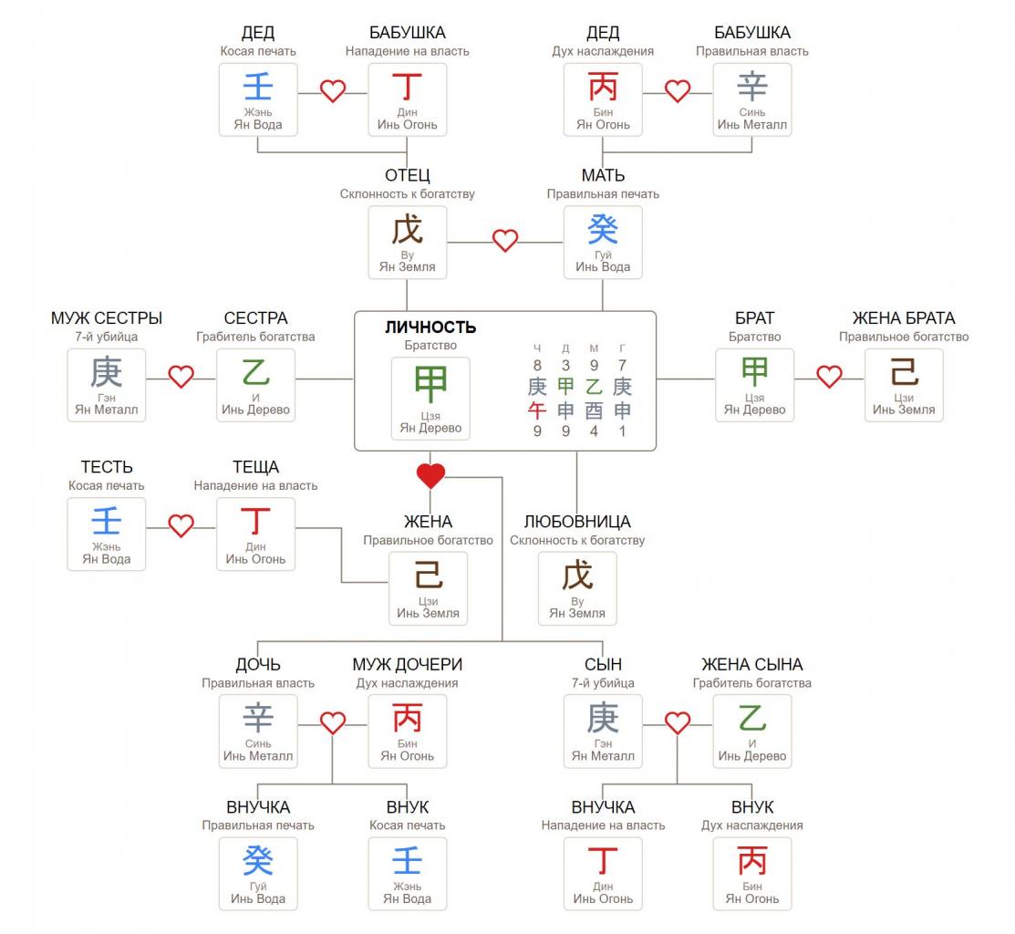Во-первых, есть схема родственных связей человека. Она строится на основе правил У Син — системы порождения и контроля: