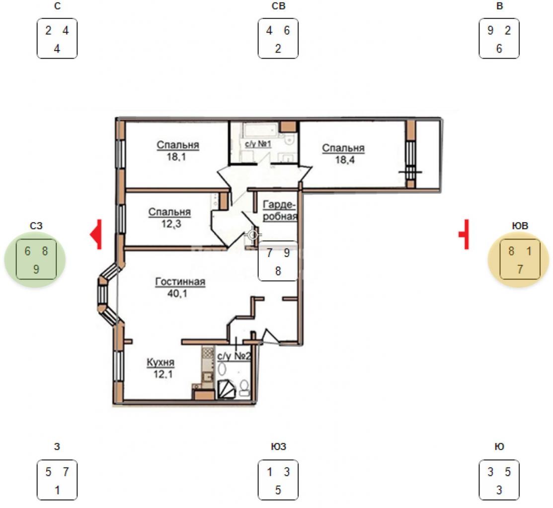 В этой квартире водная 9 попала в центр, и внешняя активность ей не поможет. А это значит, что потенциал финансового процветания такой квартиры в 9 периоде падает. В первом периоде он снизится еще больше.