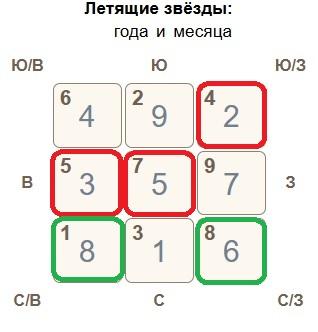 Юг. Комбинация «огненной девятки» и «звезды болезней» в огненном секторе, плюс сильный Огонь месяца, людям со слабой сердечно-сосудистой системой нужно избегать этого сектора всеми силами!!! Также могут обостриться проблемы с глазами, сердечно-сосудистой системой, мочеполовой системой. Если вы не можете уйти из этого сектора - займитесь своим здоровьем, сдайте анализы крови, сходите на профилактический осмотр. Уберите красные предметы из этого сектора, поместите здесь что-то круглое, например белый коврик, или металлические предметы, можно поставить тыкву-горлянку.