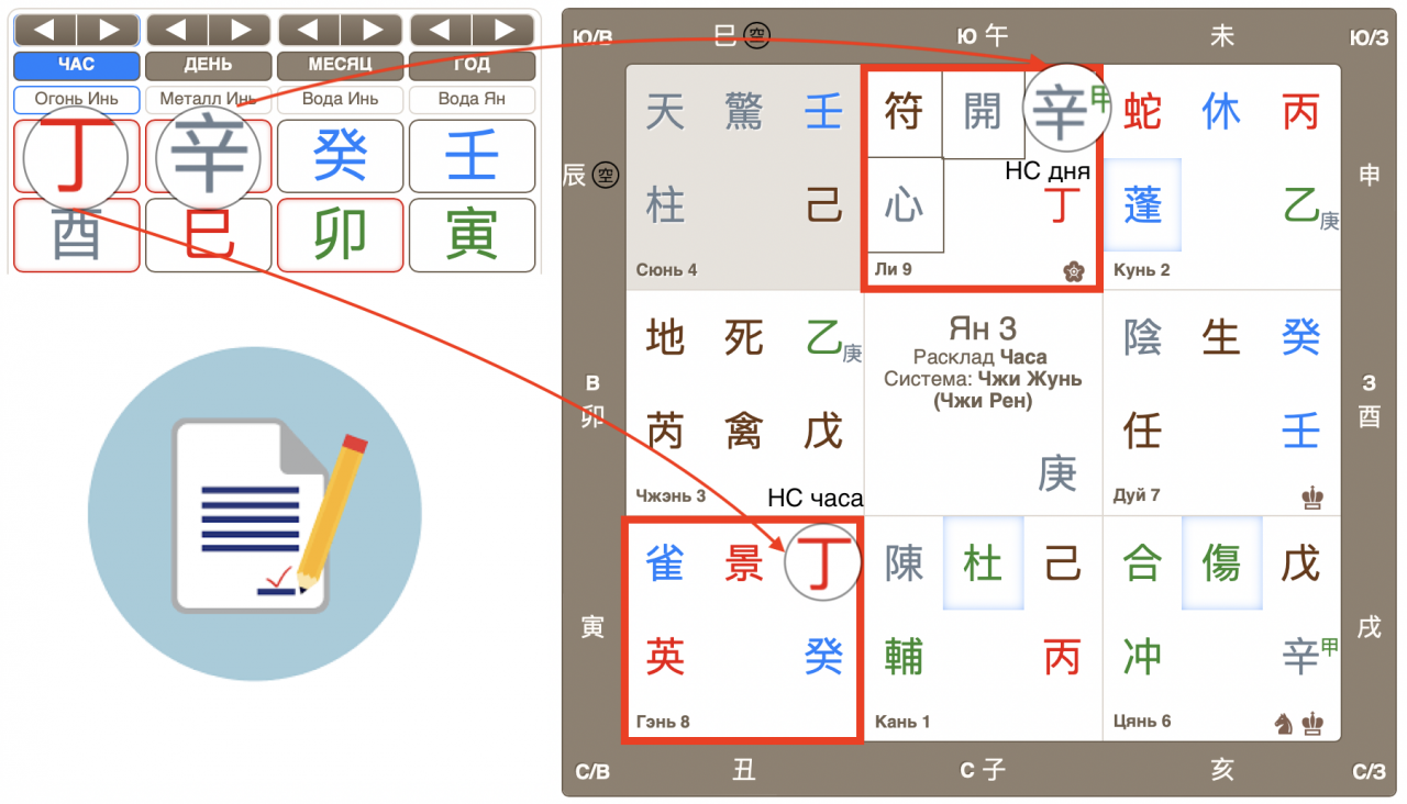 Проверяю наполнение дворцов Ли и Гэнь, куда опустились соответственно Человек – Небесный ствол дня Синь 辛 и Дело – Небесный ствол часа 丁. Дворец огня Ли порождает дворец почвы Гэнь, Человек 辛 порождает Дело 丁. Это указание на возможность благоприятного исхода.