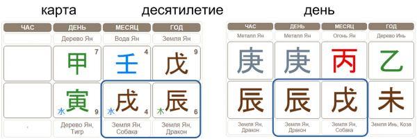 2. Дни, когда вы видите сверху такой же иероглиф как у вас в карте или такте, а внизу тот, который сталкивается с вашей картой.  В примере в карте стоит Янский Огонь на Драконе, а в дне (в месячном столпе) – Янский Огонь на Собаке. Собака и Дракон сталкиваются.