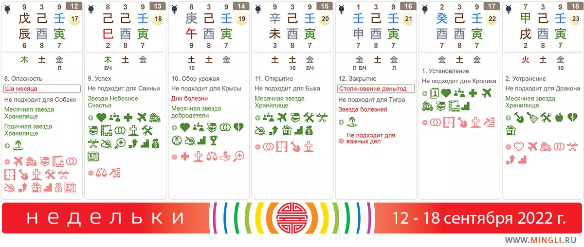 18 сентября, воскресенье. Посвятите день уборке, освобождению от вредных привычек. Можно переезжать, заниматься ремонтом, строительством, земляными работами. День подойдет для начала диеты, особенно если вы родились в день Дракона.