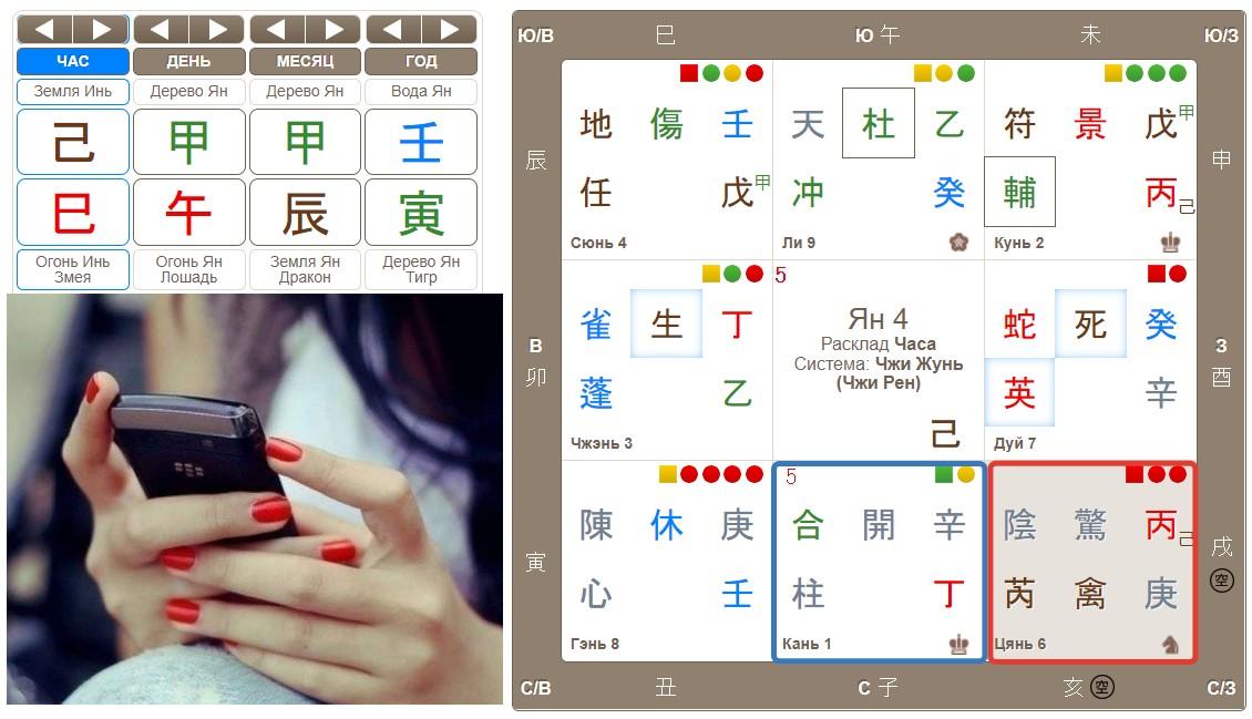 Радости сына не было предела, он купил конфеты в знак благодарности, девушка оказалась его ровесницей, симпатичной и очень скромной на вид, не сразу согласилась принять презент. А намеков на девушку в раскладе оказалось очень много: в карте Бацзы мы видим слияние небесных стволов , затем в самой карте Ци Мэнь Дунь Цзя – , и день, в котором нашлась пропажа, затронул дворцы с главными вратами и звездой, а в Ли мы видим , образ молодой девушки. Возвратившись домой, сын сказал, что верит мне, и моя сложная наука работает. 😊