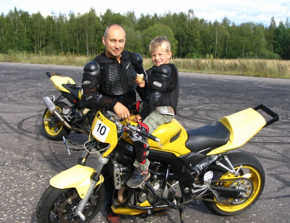 Алексей Калинин, папа Фомы – один из первых российских райдеров. В 90-х года ХХ века в Англии одному из гонщиков наскучило просто ездить, и он решил гонять то на переднем, то на заднем колесе. Так родился стантрайдинг. Чтобы выполнить трюк, райдер работает сцеплениями, тормозами, балансирует, сдерживает мотоцикл. Работа эта почти ювелирная, выполняется легкими нажатиями на различные рычаги. Алексей не только тренировался и выступал, но также основал свое дело, собрал команду.