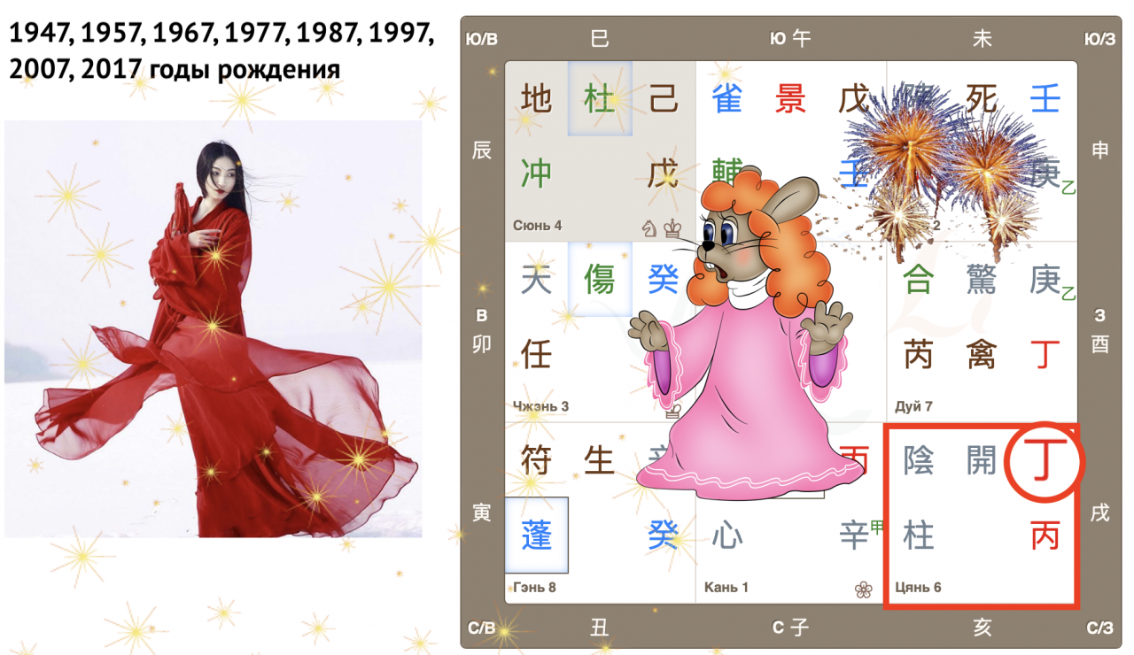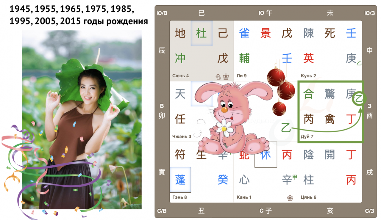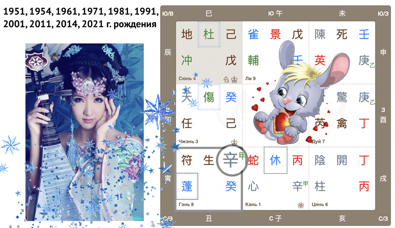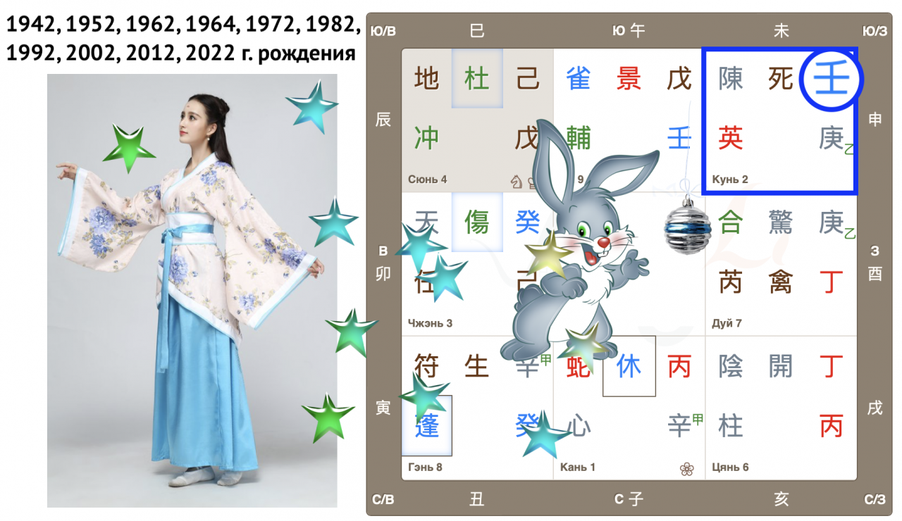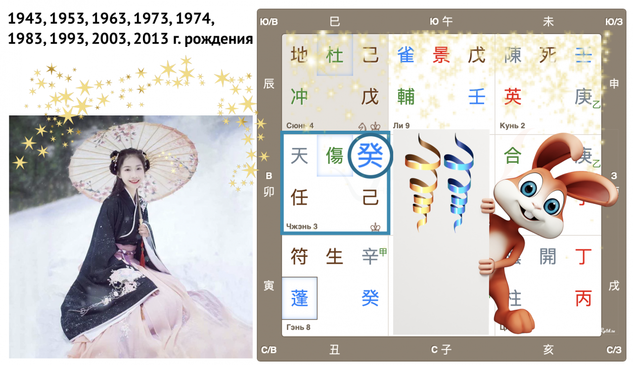 Как видим, Небесный ствол года 癸 Гуй (иньская вода) опустился в дом Чжэнь с Земной ветвью 卯 Мао (Кролик). Вот так сюрприз! Ствол и ветвь приходящего года в одном дворце, так случается далеко не всегда. Можем предположить, что влияние энергий года четко выражено, удвоено.