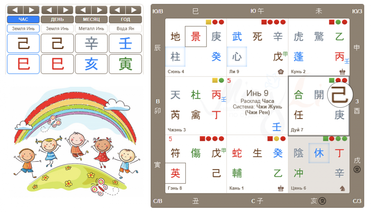 И решила я выбрать время для проведения юбилея пятилетнего сына. В раскладе часа Небесный ствол и Небесный ствол часа Цзи опустился в Дом ДУЙ – очень подходит для дружной компании детей, а открытую атмосферу создают врата Открытия – праздник на «широкую ногу», звезда Небесный чиновник из дома «младшего сына» Гэнь прямо указывает на «виновника» торжества. И один из любимых мной духов Лю Хэ, который соединяет приглашенных под одной крышей, чтобы отметить радостное событие.
