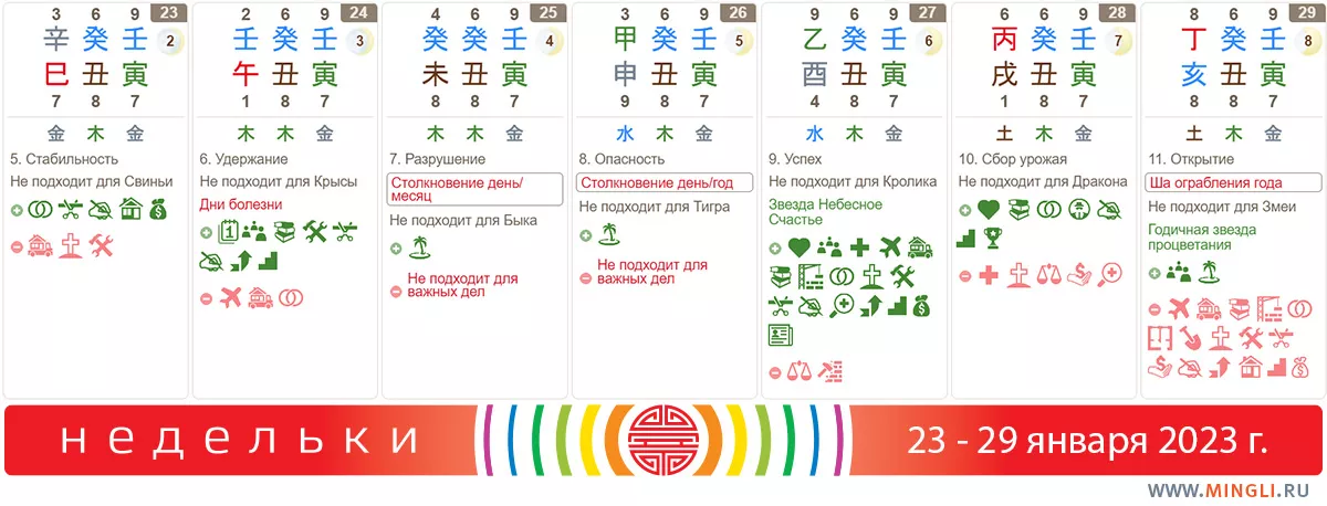 23 января, понедельник. Отличный день для большинства позитивных дел, особенно если Металл вам благоприятен. Используйте час Лошади или Собаки. Не подходит понедельник тем, кто рожден в год Свиньи. Вот ведь… как хороший день – так и сказать особо нечего, не то, что в плохой 😃. Дерзайте!