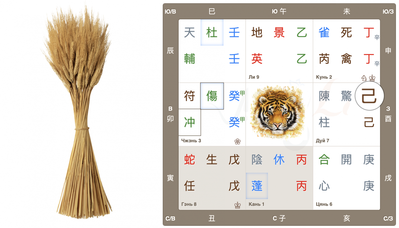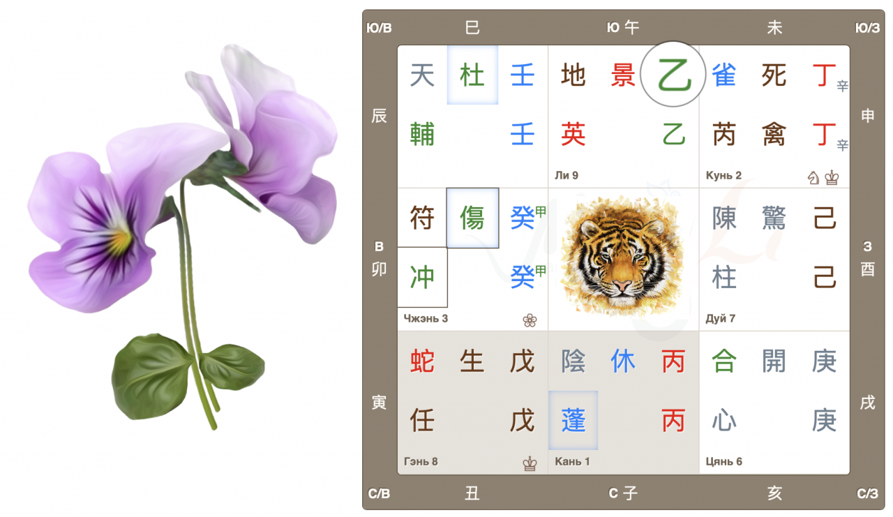 Дворец Чжэнь, движение Дерева, начало нового, быстрый рост. Врата ранения 傷 находятся в своем домашнем дворце и являются главными в раскладе. Это очень активные, азартные врата, жаждущие перемен, перемещений и поездок. Настала весна, время двигаться, и люди этого хотят. Да и родная звезда 冲 также добавляет мощный импульс для начинаний.