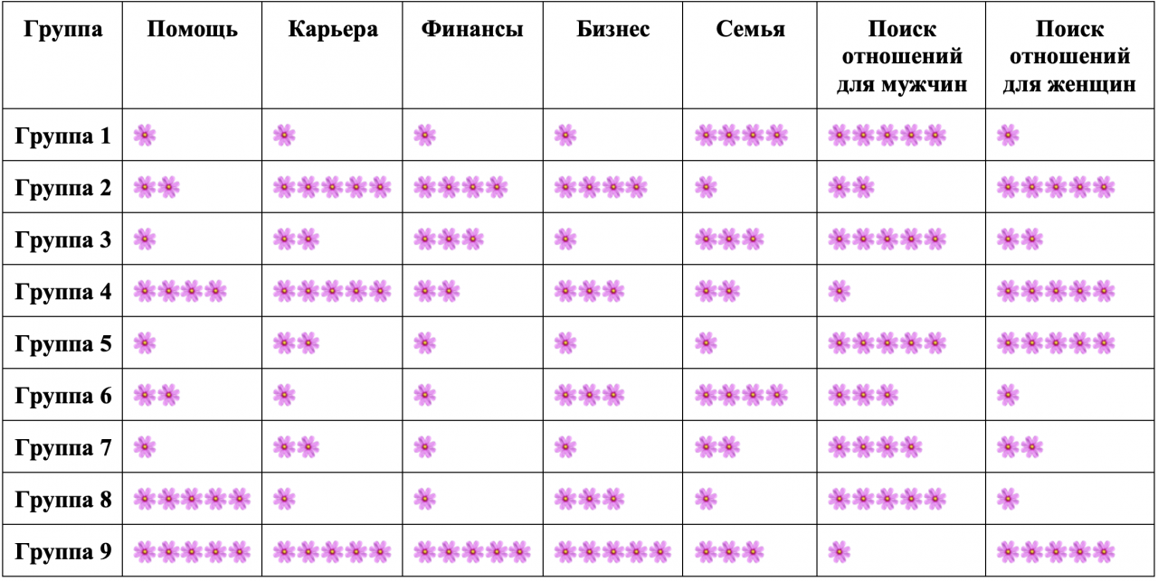 Для наглядности мы обобщили прогноз и сделали таблицу, где показали уровень удачи в той или иной сфере. Один цветок – это обычная удача. Максимальный уровень, пять цветков – лучший вариант.