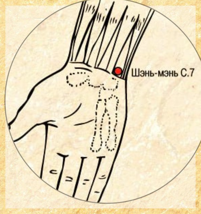 а. Массаж точки Шэн-Мэнь в течении 1,5 минут (на правой руке – по часовой стрелке, затем на левой руке – против часовой стрелки).