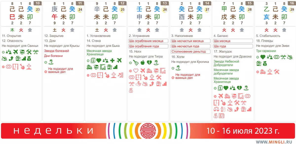 16 июля, воскресенье. Пожалуй, самый симпатичный день на неделе. Он благоприятен для занятий литературой и путешествий, переезда в новый дом, ремонта, земляных работ, встреч на официальном уровне и с благородными людьми. Действия в этот день принесут большое богатство и прекрасного сына (если нужен, конечно). Каковы нюансы? Это день сильной ци Дерева, поэтому, если Дерево вам не полезно – что ж, придется подождать другого хорошего дня. Но если Дерево отлично заходит в карту – запланируйте на этот день что-нибудь значительное!