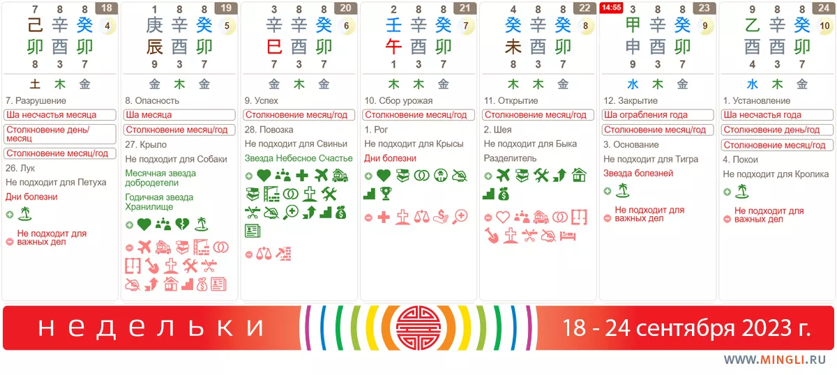 18 сентября, понедельник. Начинаем немного нервно, но что поделать. На работе рваться вперед не стоит, лучше доделать незаконченное. Постарайтесь избежать конфликтов, особенно если в вашей карте Бацзы есть Кролики-Петухи. Лучше надеть черное – это поможет гармонизировать влияние энергий дня. День травмоопасен, поэтому осторожнее режем салатики, не рискуем во время занятий спортом и крутим руль только по правилам, внимательно смотря по сторонам. Навещать заболевших друзей и начинать лечение не стоит.