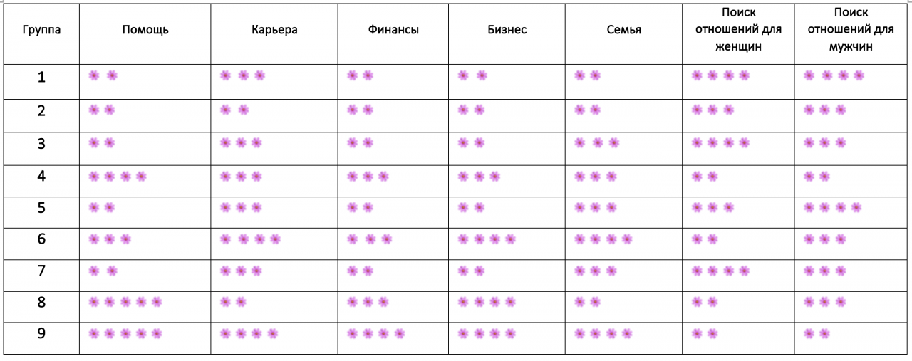 Для наглядности мы обобщили прогноз и сделали таблицу, где показали уровень удачи в той или иной сфере.