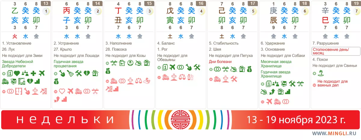 13 ноября, понедельник. Хорош для планирования, встреч, обсуждений, свиданий. Окончательные решения принимать не стоит, но вот рассмотреть все аспекты дела, поискать ресурсы и подводные камни – точно нужно, особенно, если Вода и Дерево вам благоприятны. Для супер-важных дел не годится.