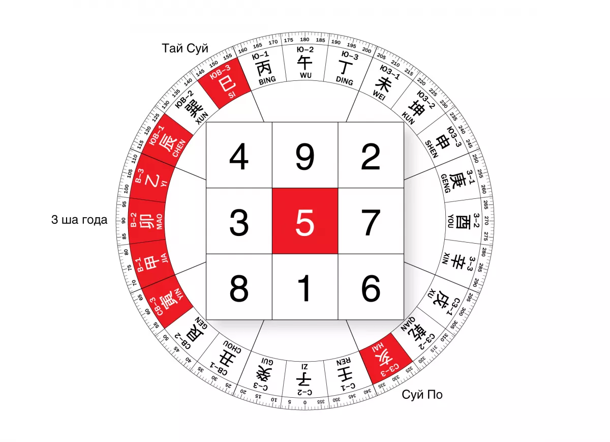 Князь ГодаТай Суй 太歲– самая сильная энергия года, соответствующая земной ветви года, поэтому тревожить ее не стоит. Не рекомендуется затевать ремонт в Тай Суй, особенно серьезный, со сверлением стен и шумом, копать землю в этом секторе. Не стоит также сидеть лицом в направлении Князя, даже если это благоприятное направление по числу ГУА. Результатом излишней активности в этой области могут быть травмы, аварии, серьезные заболевания.