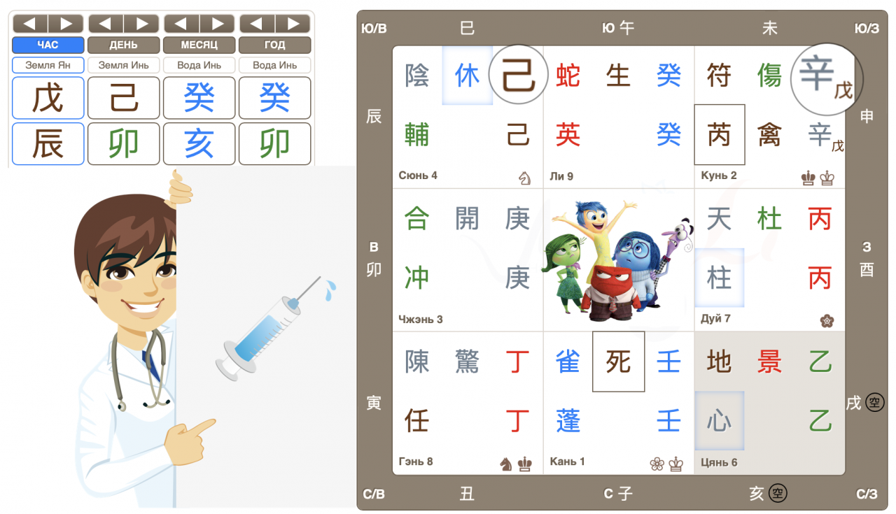 Но на приеме события начали развиваться стремительно, и вот я уже получаю направление в процедурный кабинет, а после прививки необходимо вернуться в кабинет врача для завершения процедуры. Испытываю смятение, но иду 😊. К моему счастью, перед процедурным кабинетом выстроилась очередь, да еще нашлись желающие ее обойти, впрочем, обычное дело в поликлинике. Но мне это дало фору во времени, я успокоилась и…вспомнила о Ци Мэнь. Быстро построила расклад. Задаю вопрос: «Стоит ли мне сейчас делать прививку?»