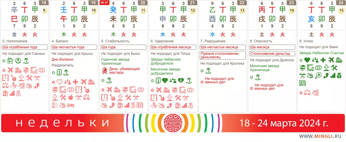 24 марта, воскресенье. Очень благоприятный день, содержащий большое количество разных благородных звезд. Хороший день для свадьбы, начала бизнес-проектов, переезда в новый дом, путешествий, строительства. В течение 60-120 дней принесет неожиданное богатство, полезную помощи и поддержку полезных людей. Очень благоприятен для исполнения желаний.