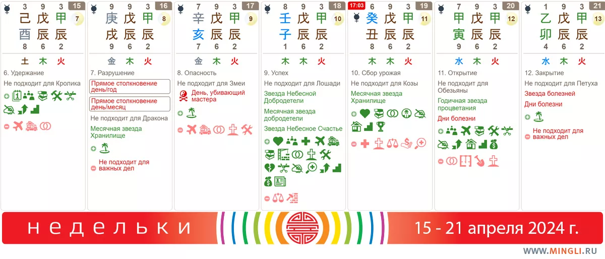 18 апреля, четверг. Несмотря на то, что в день присутствуют благородные помощники, в нем мало ци, поэтому этот день подходит только для незначительных дел. Если есть возможность выбрать другой период времени – лучше подождать. То есть день – хороший, но слабый.